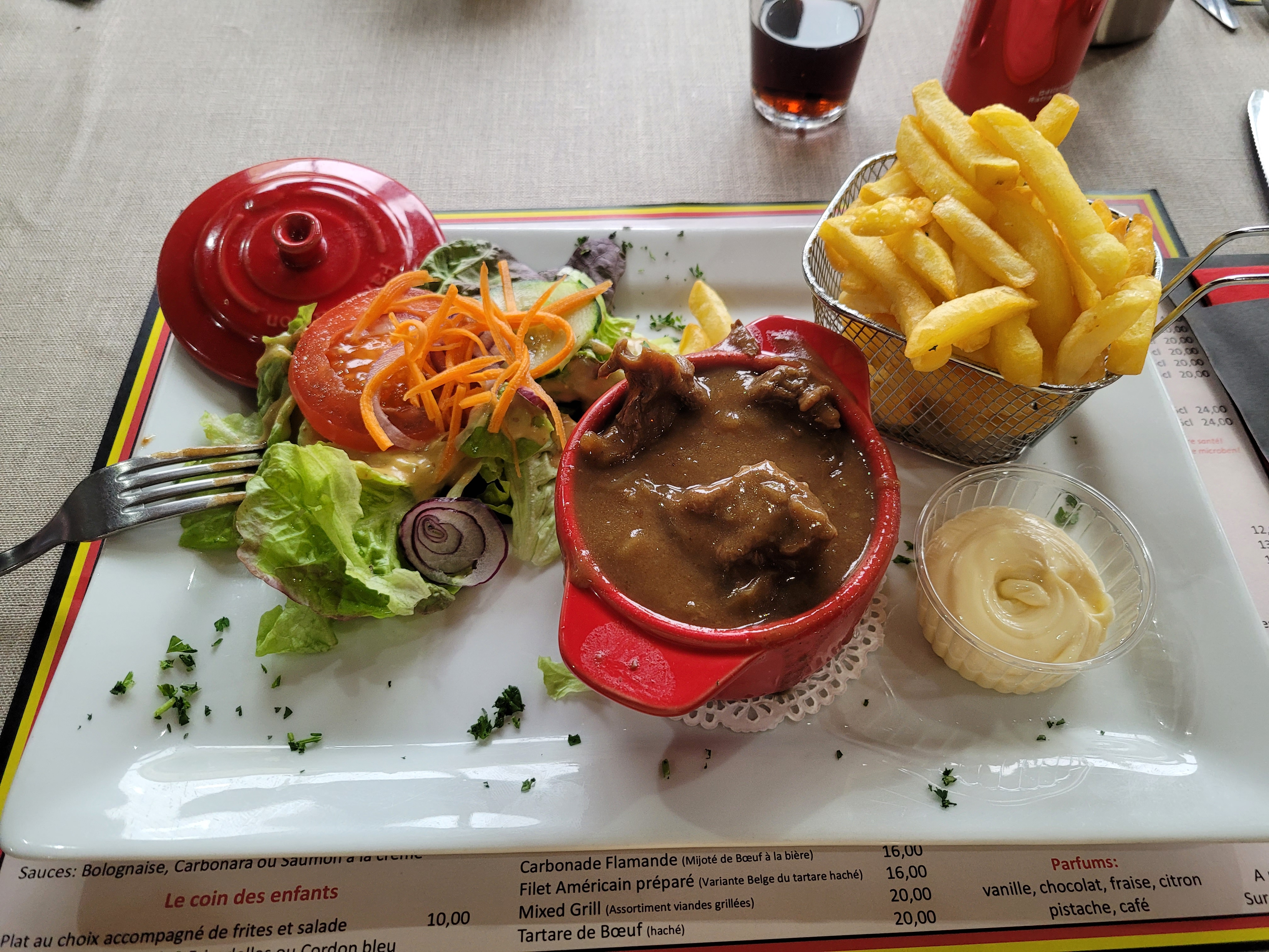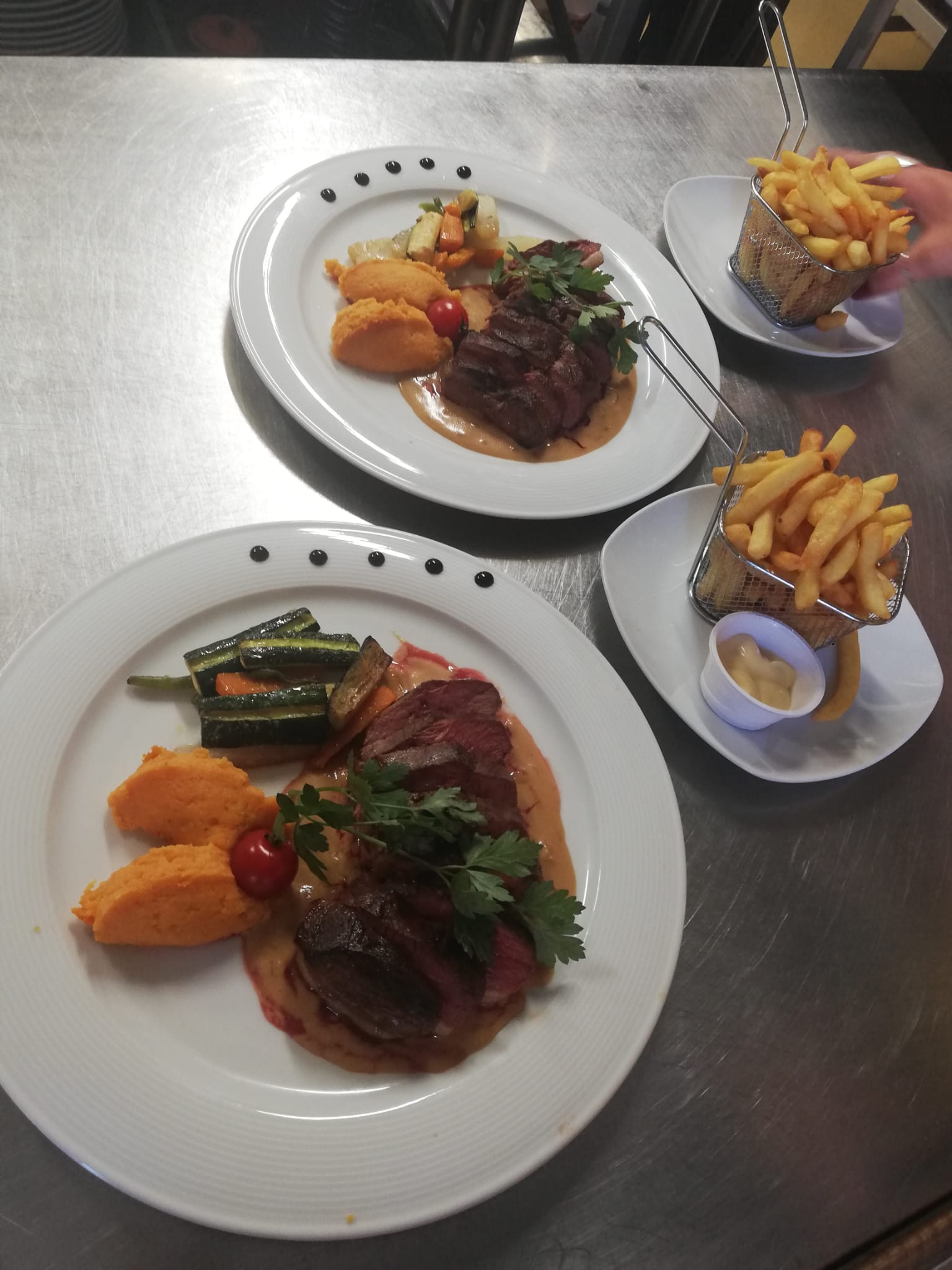 Le goût de la nourriture était très bon, malheureusement il y avait par ex. filet de beauf et carbonade flamande pas très tendre. Les spaghettis à la bolognaise ont bon goût. Les portions sont de bonne taille, mais pourraient être un peu plus grandes. Les hôtes sont très sympathiques et le restaurant a beaucoup de charme. Malheureusement, les frites n'ont pas répondu aux attentes de la célèbre passion belge pour les frites, mais elles étaient bonnes.