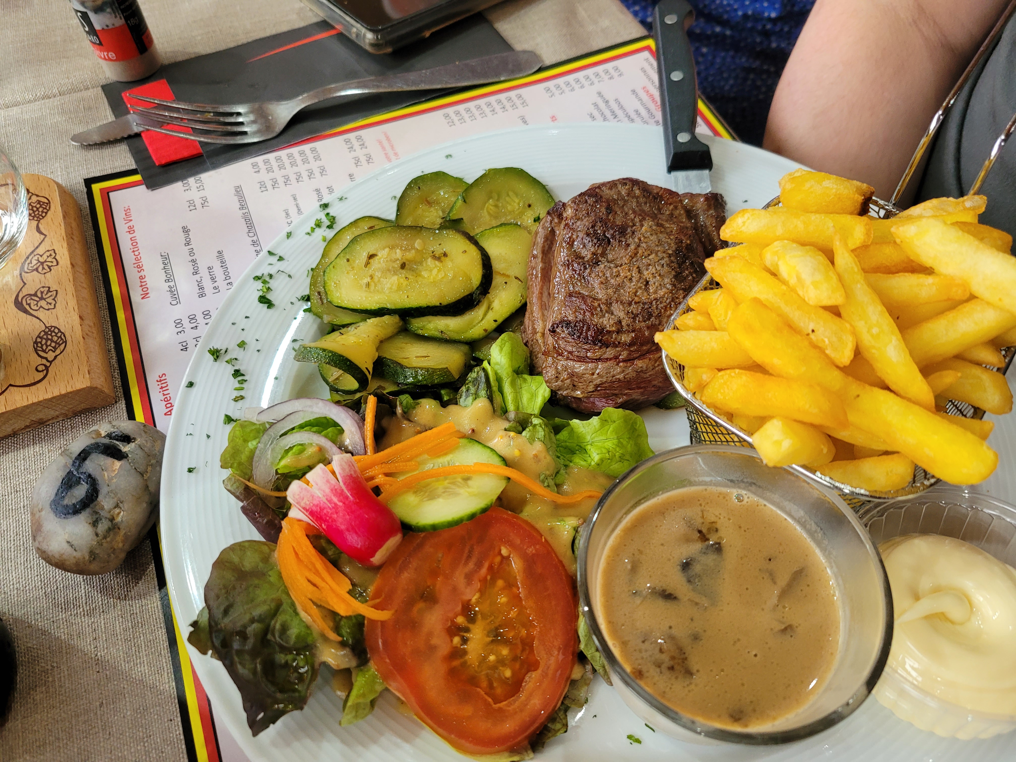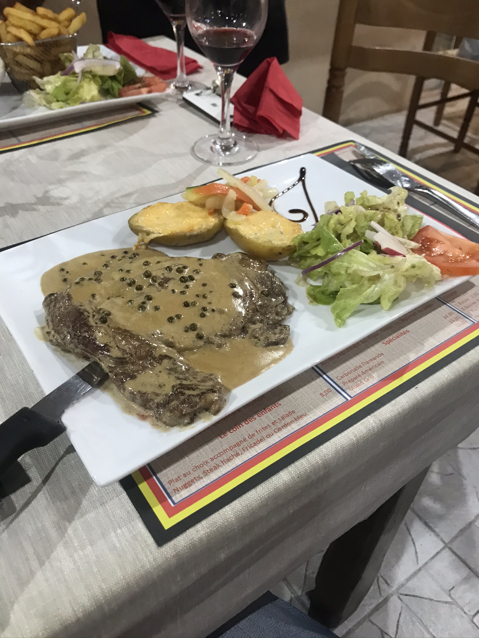 Bof. Frites, steak et pain decongeles. Peu de bières pression pour un bar belge.