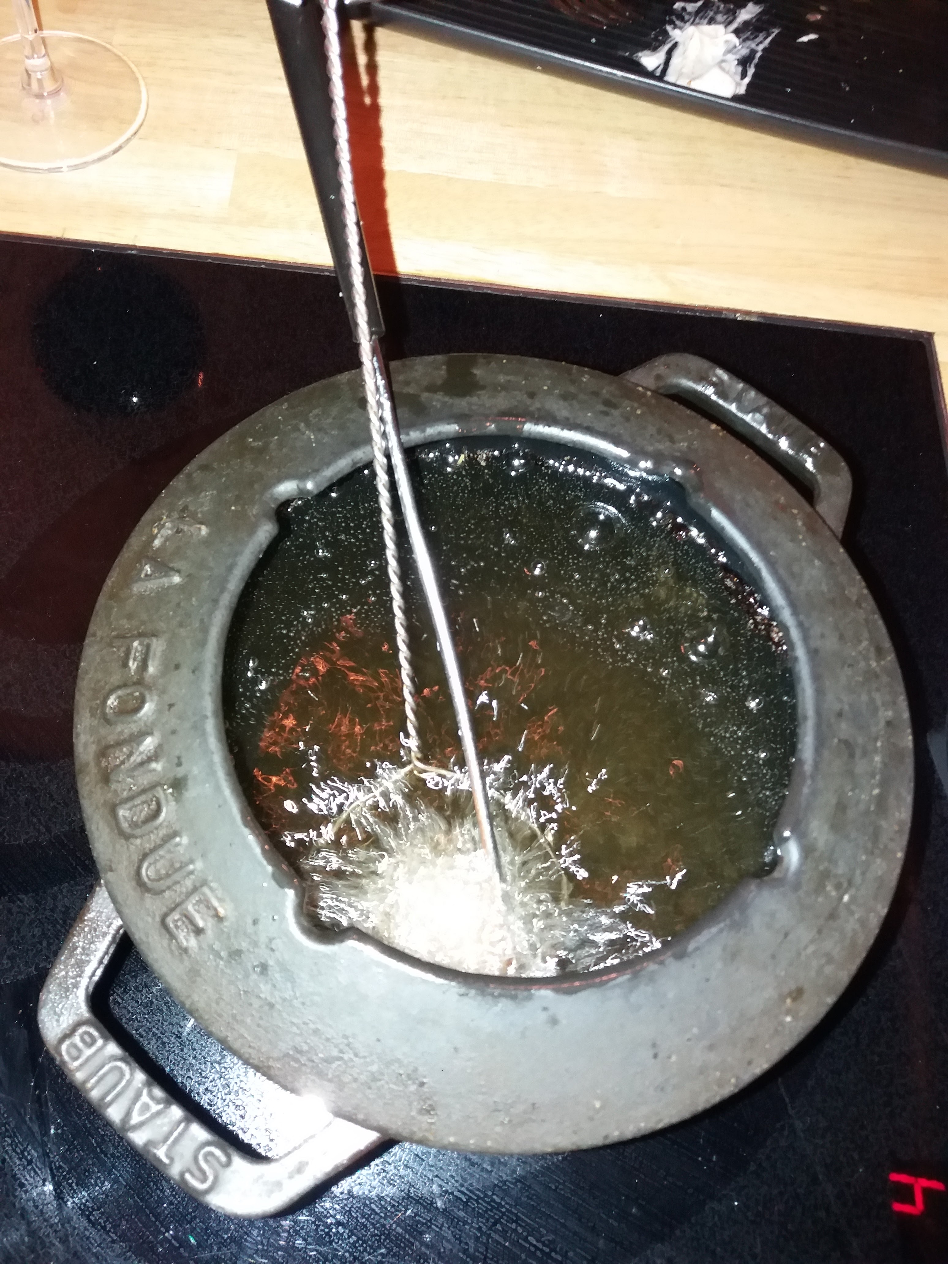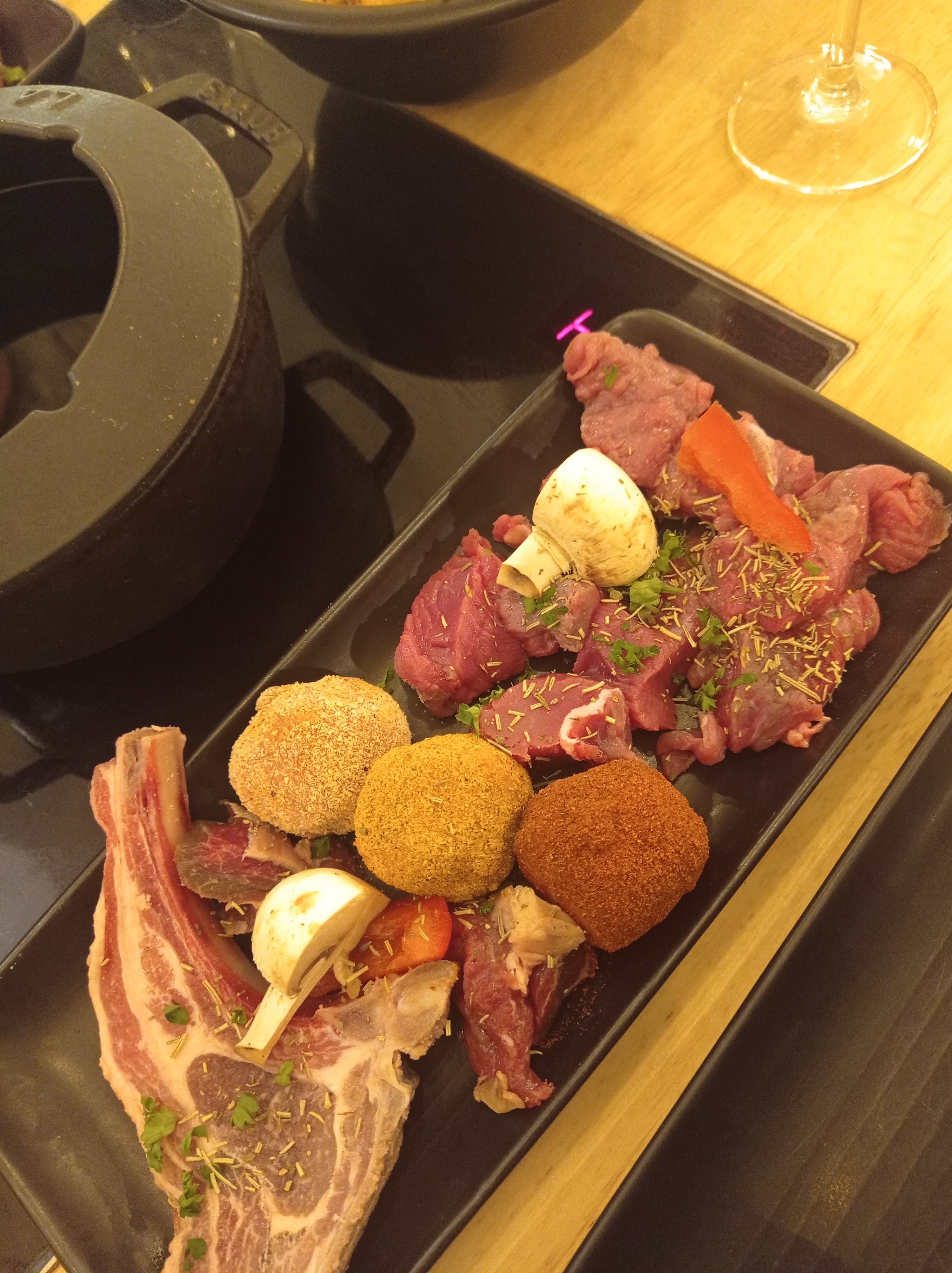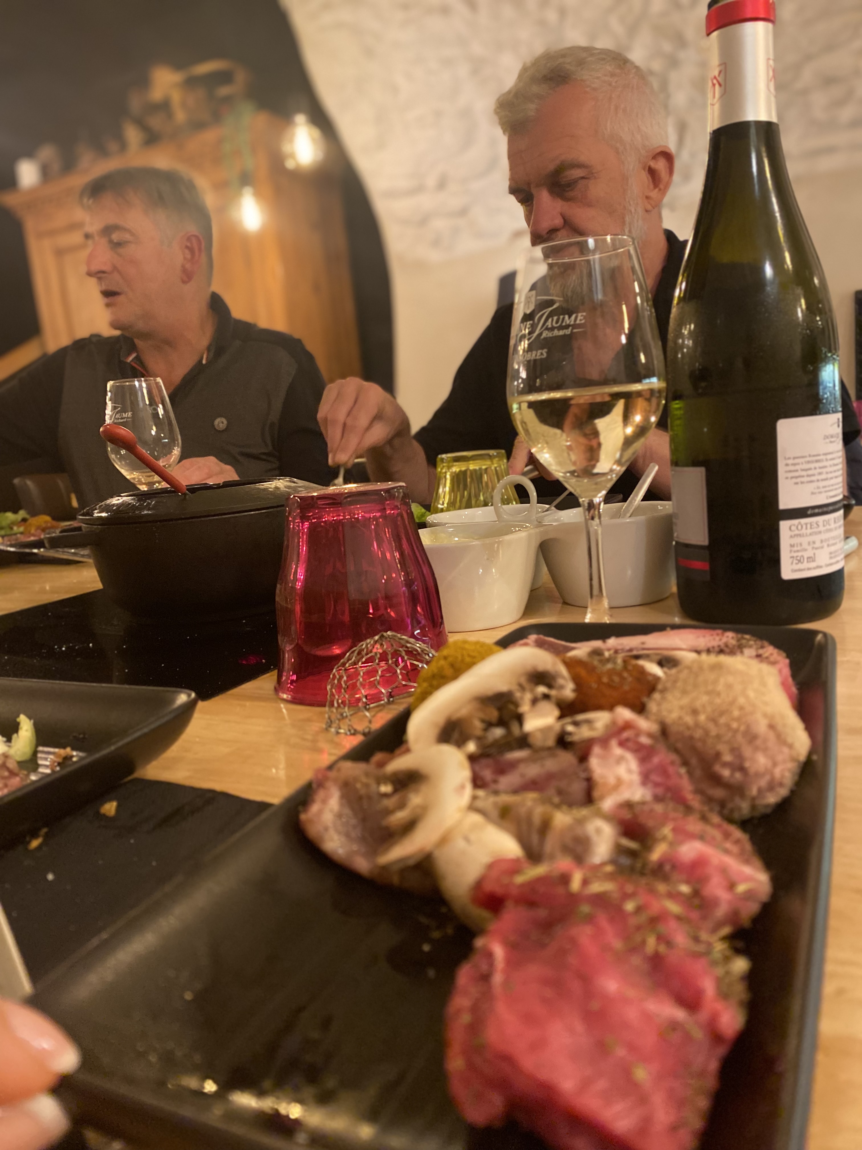 Repas entre amis avec fondue bourguignonne, un bon moment de partage.