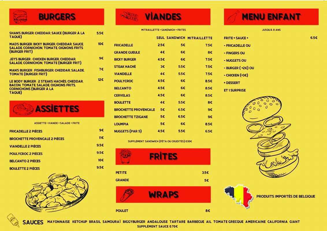 Je suis un client fidèle à la friterie belge, je connais toute la carte , l’ambiance et familial et chaleureux , les plats sont copieux est excellent, j’adore la spécialité belge et les tarif sont très raisonnable .