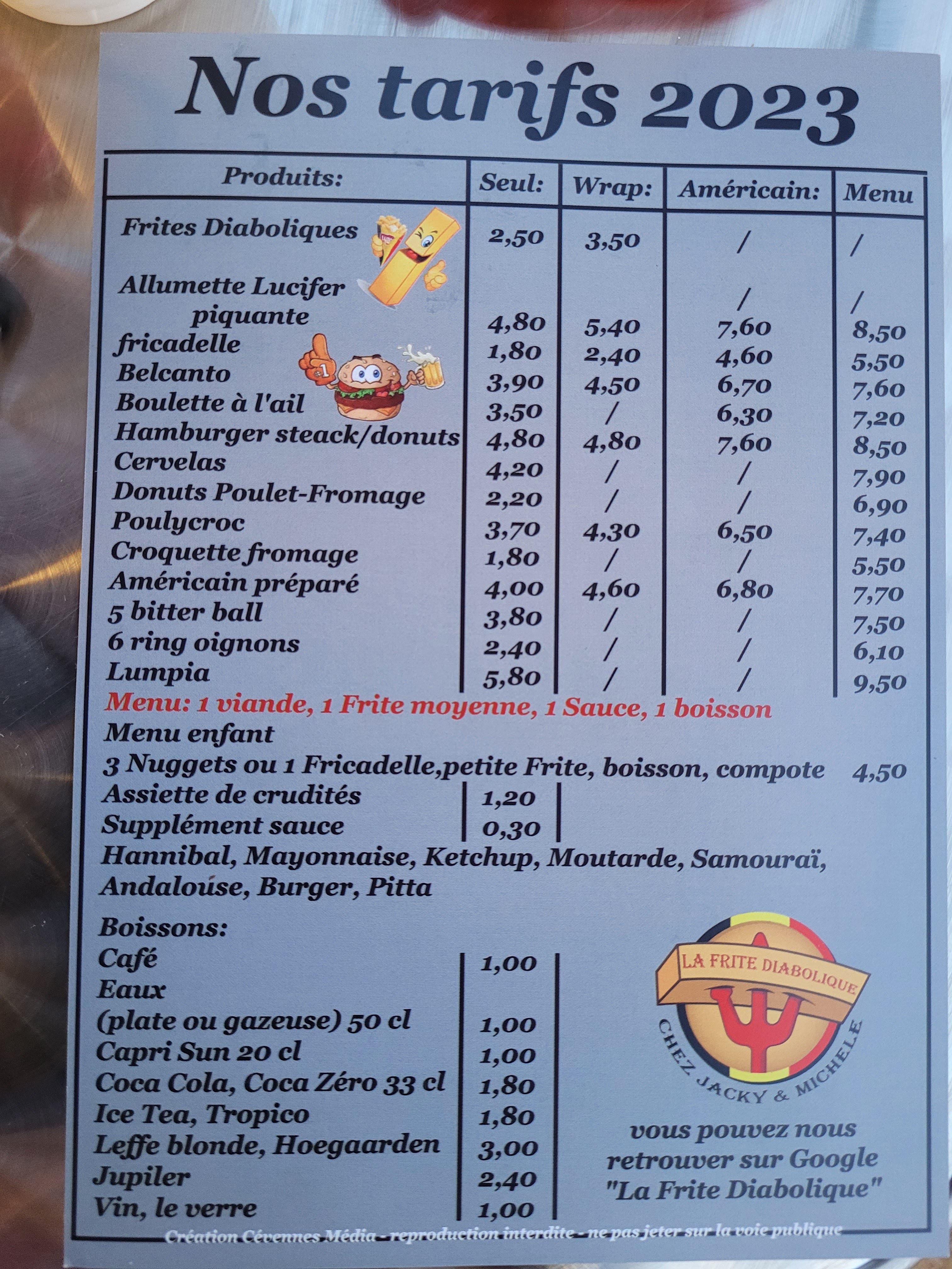 Nous étions en vacances à côté de la frite diabolique et nous avons été très contents de profiter de leurs frites à plusieurs reprises. Très bonnes frites, Jackie et Michelle sont adorables, on recommande