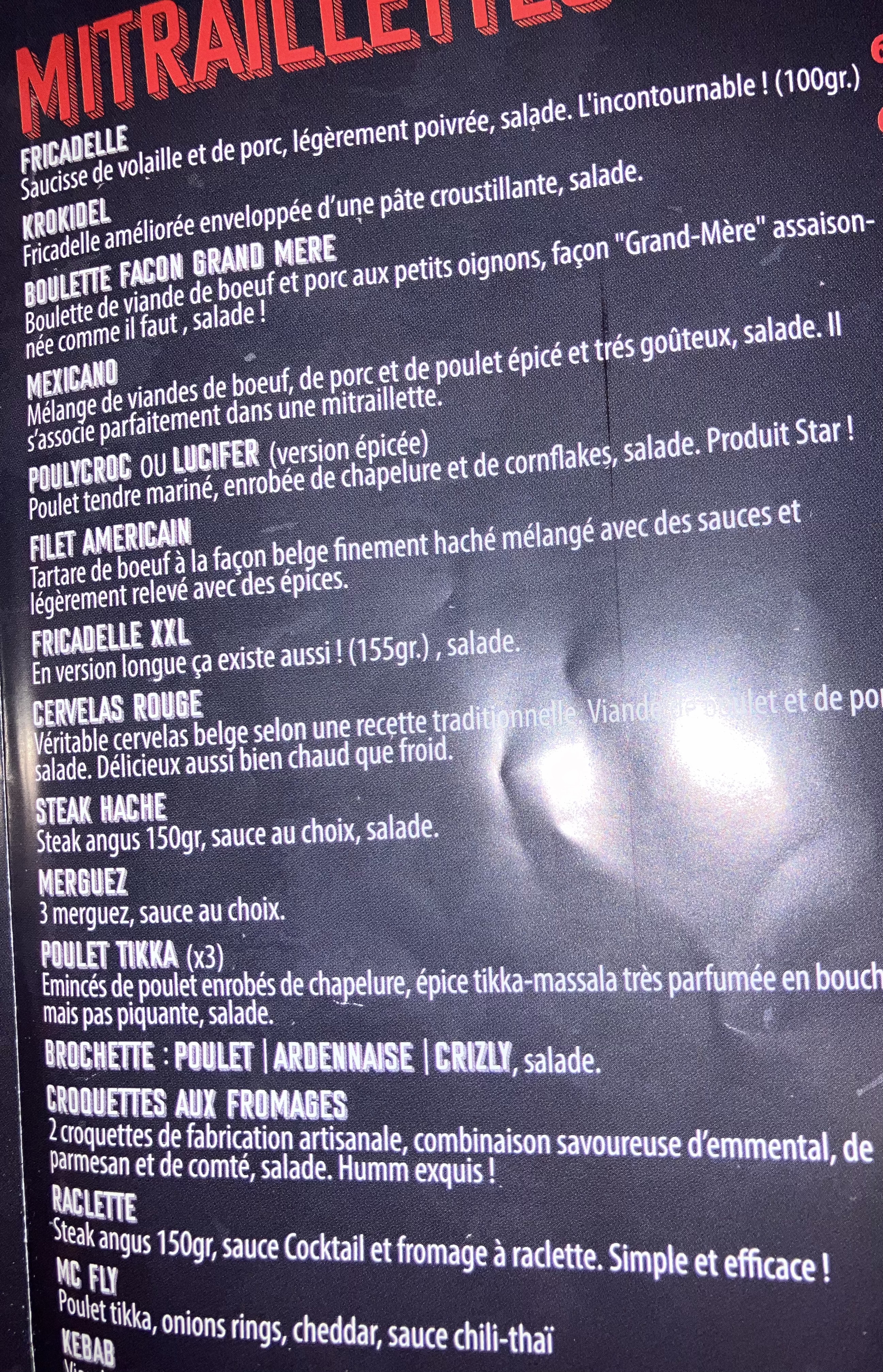 De toute les friteries hors du nord que j'ai goûté , celle la est la meilleure , on a plusieurs choix de repas : les mitraillettes ( pain ciabatta avec snack de votre choix accompagné de la sauce de votre choix ) , des hamburgers et des snacks ( fricandelles , steak , brochette grizli et autres) Et en plus de ça , leurs feites sont maisons et elles sont justes succulentes . Tellment je me suis régalé , j'y retournerais :)