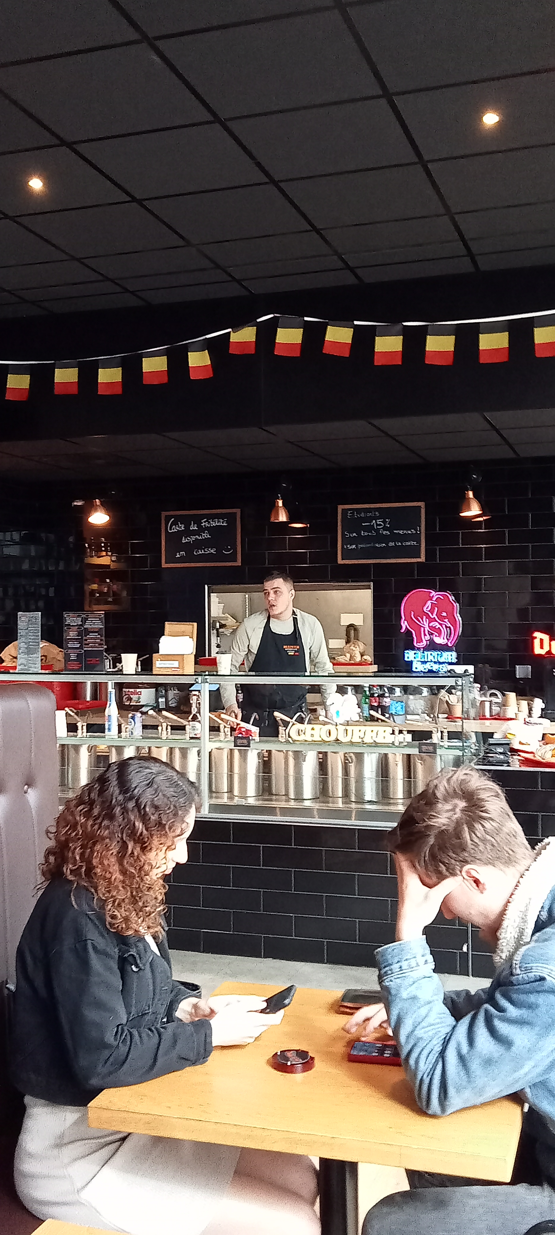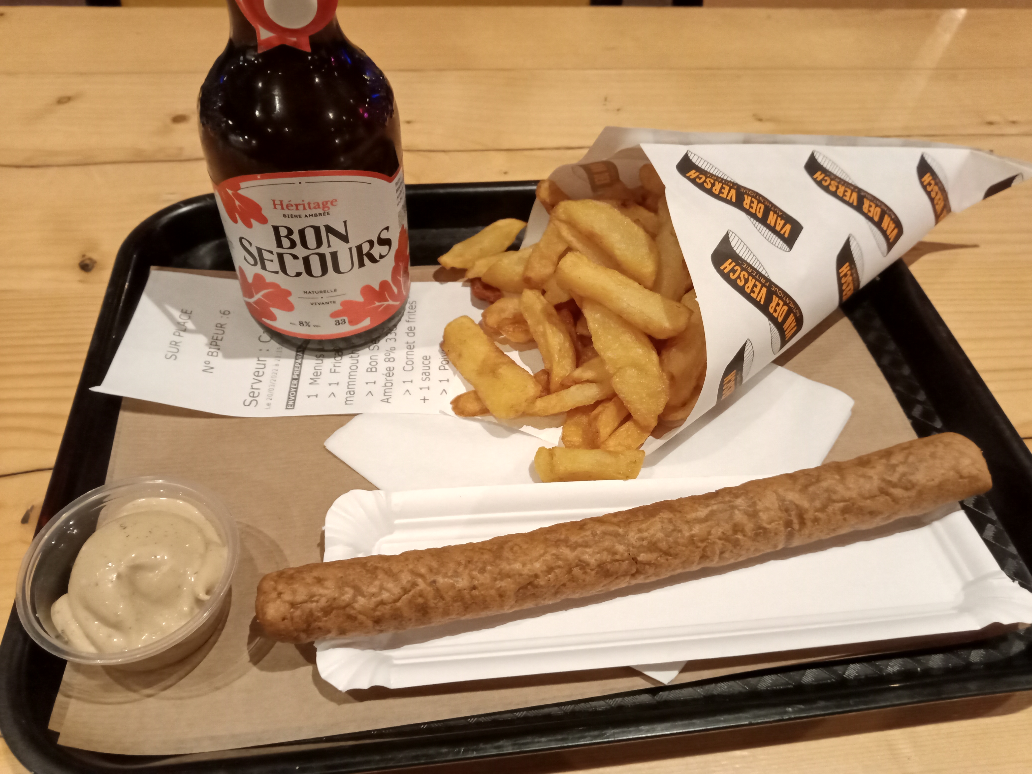 Pas de bol : des problèmes électriques/informatiques. Mais la commande a bien été servie : de bonnes frites et de bons snacks belges. C'est la 1ère fois que je reste sur place. Le boîtier d'alerte signale que la commande est prête, c'est cool