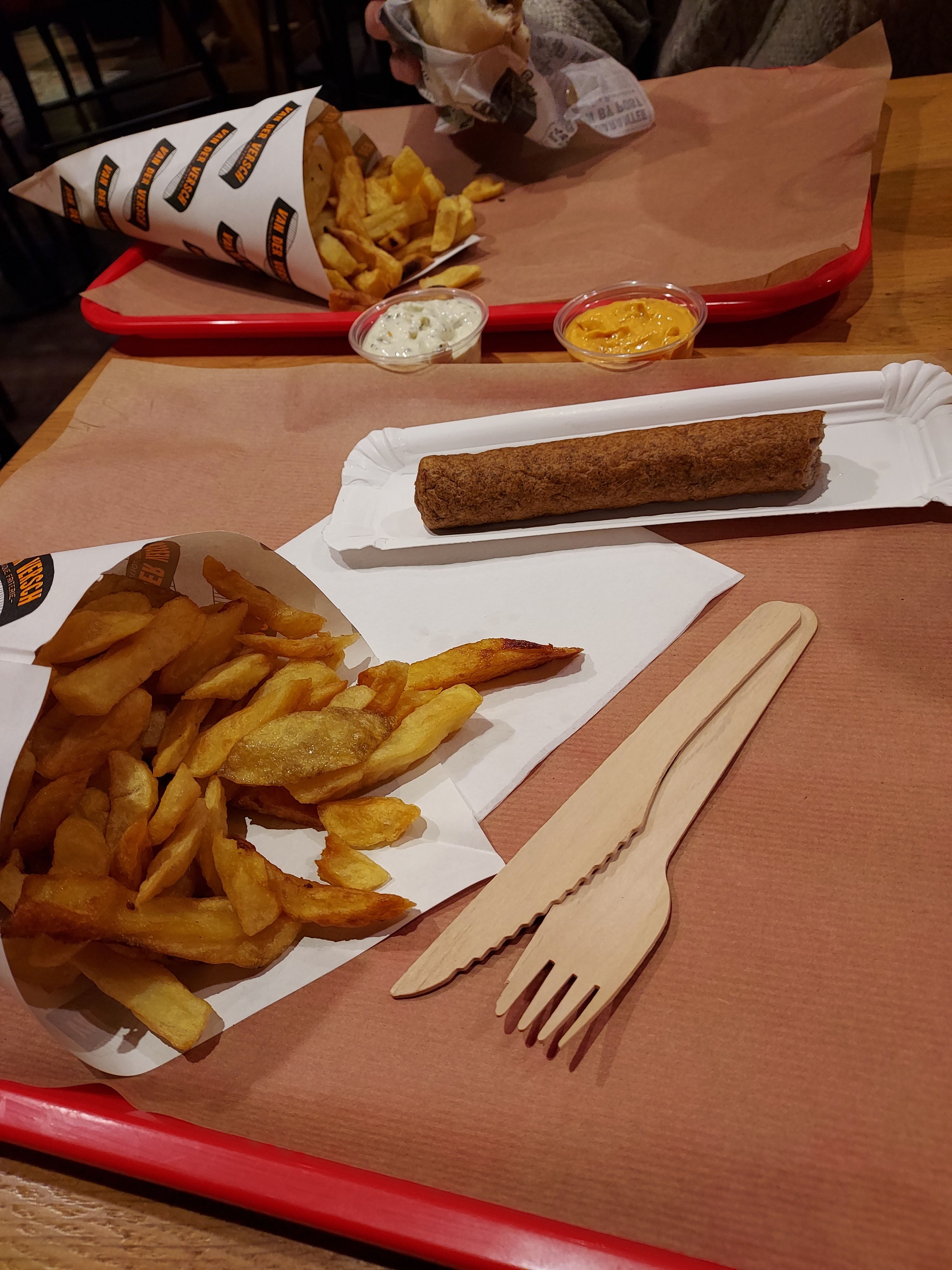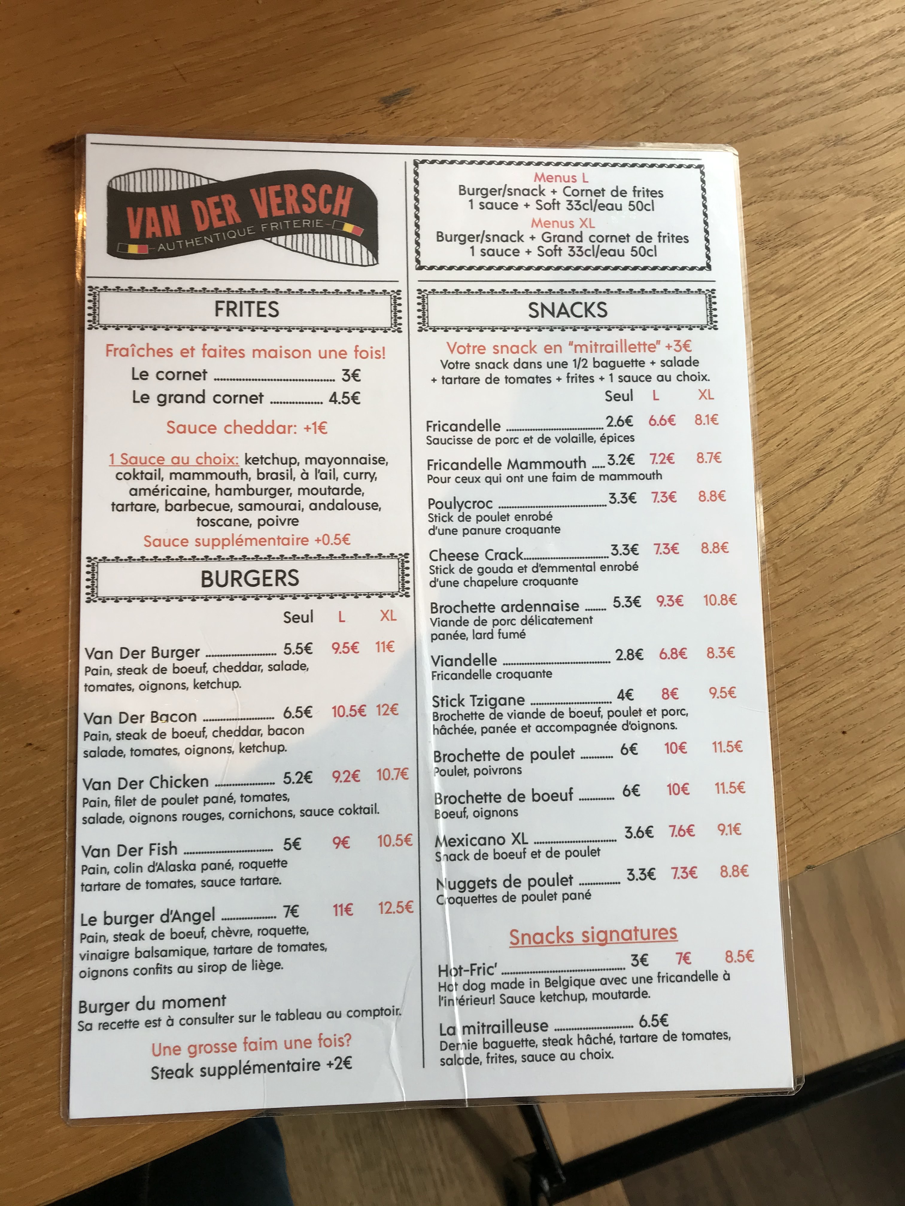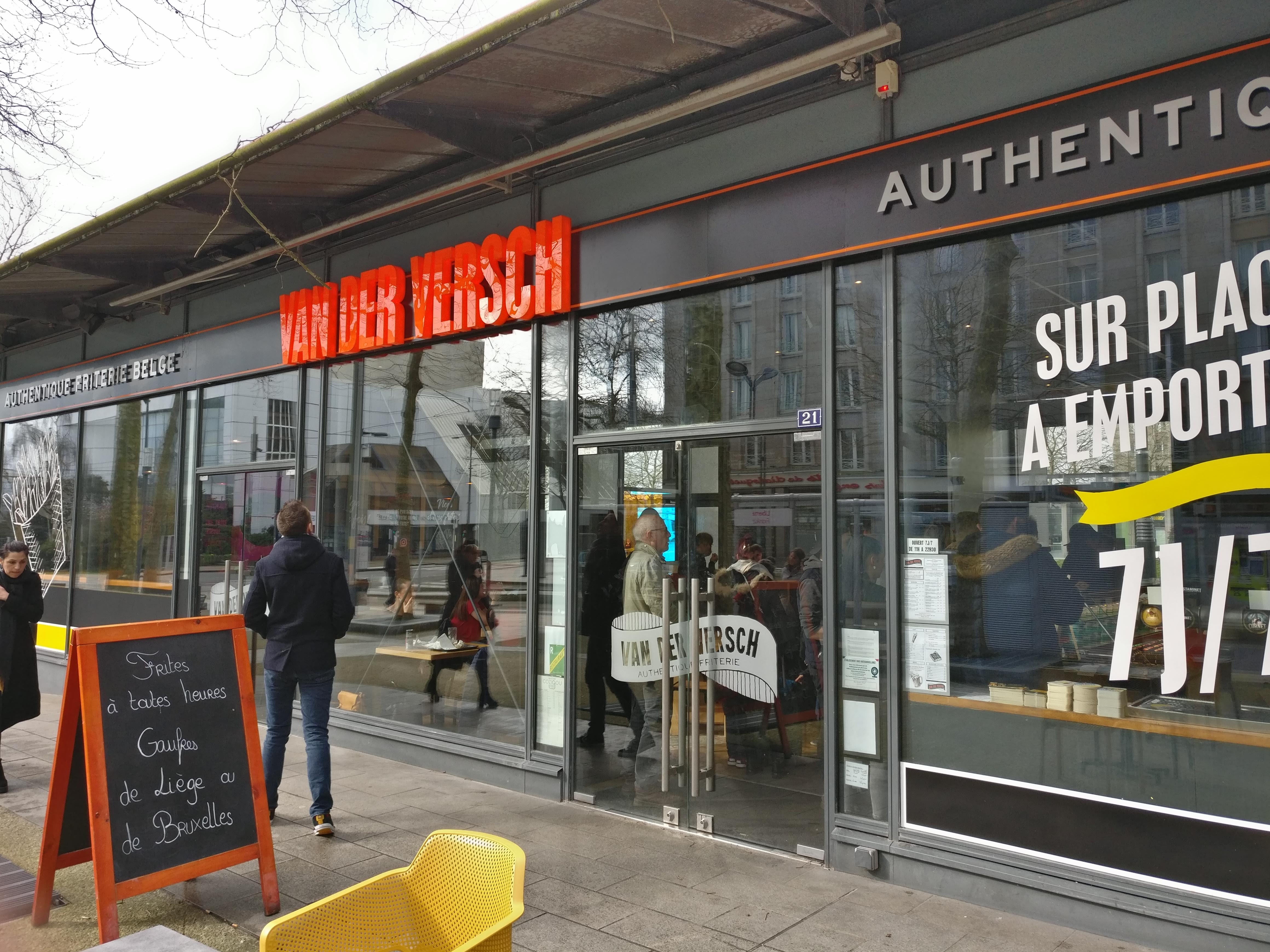 Van Der Versch, est LA baraque à fritte de Brest ! Non seulement elle est super bien placée, car en tant qu'étudiante, en sortant de la fac pour aller vers mon arrêt de bus je peux passer prendre commande et sinon bah... C'est au centre donc c'est cool haha. Le personnel est d'une gentillesse, je ferais bien un petit big up au monsieur qui remet les commandes pour son humour et sa sympathie qui sont plus qu'agréable lorsqu'on vient au restaurant. Ils ne proposent pas que des frittes mais des assortiments qui sont d'une qualité, plus que magnifique ! Ils proposent aussi les frittes au kilo, ce qui est très très bien selon moi ! Le restaurant à l'intérieur est magnifiquement décoré et organisé ce qui donne à cette baraque, un petit côté encore plus cosy ! Je recommande car c'est parmi in des meilleurs restau de Brest et en même temps le prix est peu cher pour la qualité que c'est !