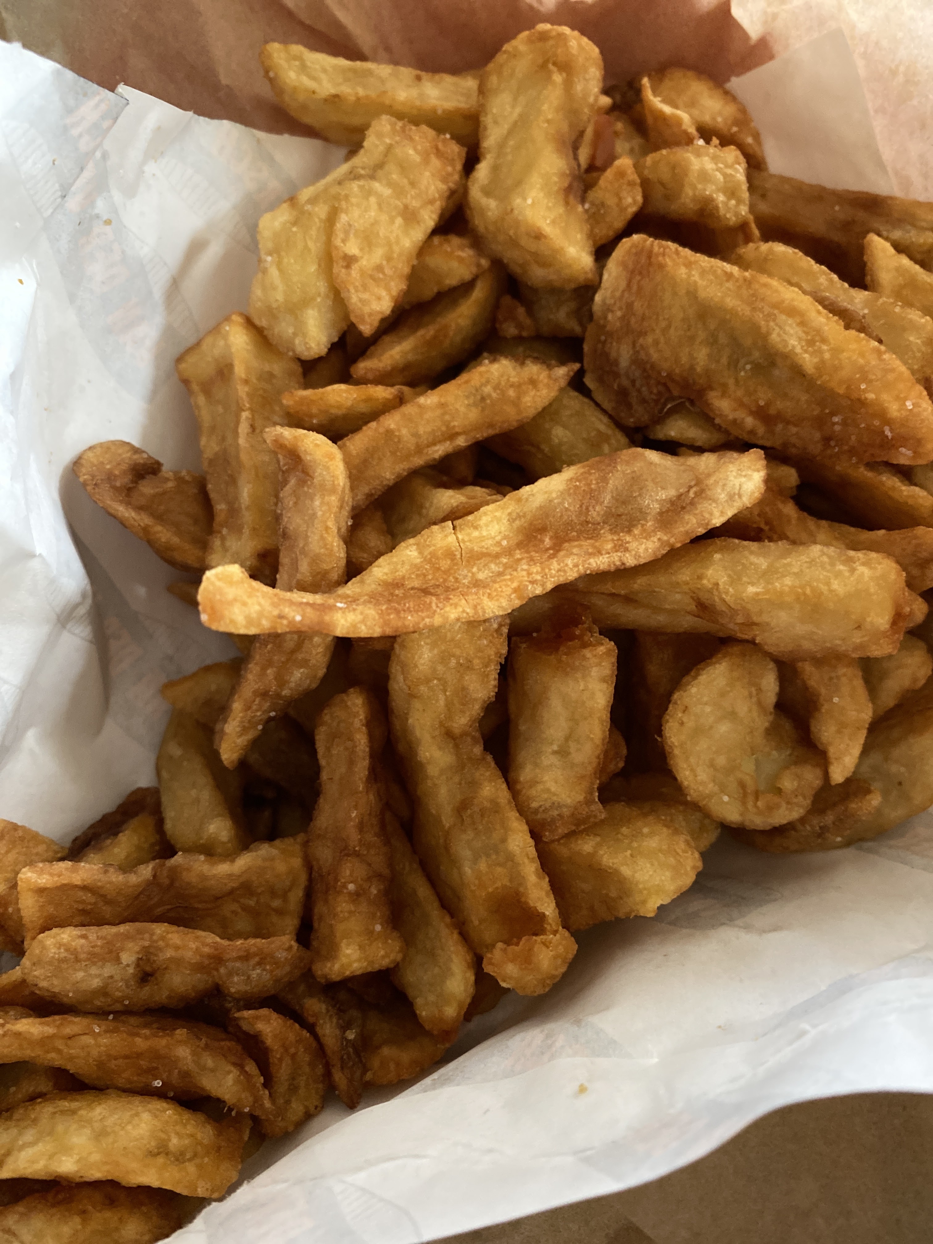 Ça fait deux ou trois fois que j'ai commandé chez vous ces deux derniers mois, et assez déçu pour ce qui est des frites. À chaque fois le cornet est remplis de chutes de pommes de terre (evidemment trop cuites et dures) et les rares frites, qui ne dépassent pas 2 cm de longueur, sont les moins dures du cornet. C'est là leur seule qualité. Je pense pourtant pas avoir une tête à mâcher des cailloux. Baisse de la qualité bien visible depuis ces dernières années, pour un prix assez conséquent finalement.